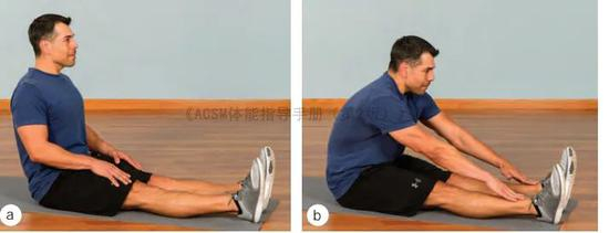 1。上身直立,坐在地板上,双腿伸直,双手放在双腿上(a)。