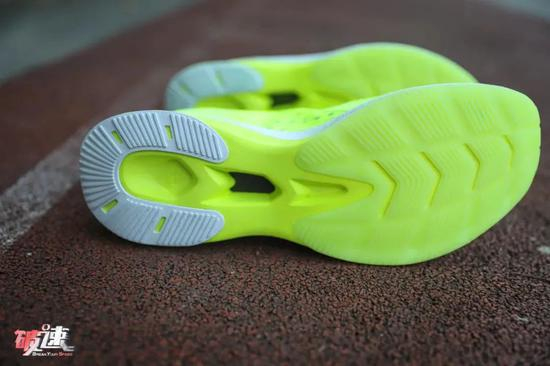 跑鞋中底态极材料后掌使用的更多,踩下去感觉后掌更软一些,前掌要稍硬一些。跑鞋前掌有个明显上翘的弧度,在开跑初期体力充沛时,尝试加速时,前掌落地会明显感觉跑鞋从中足有个过渡,将你向前推进。