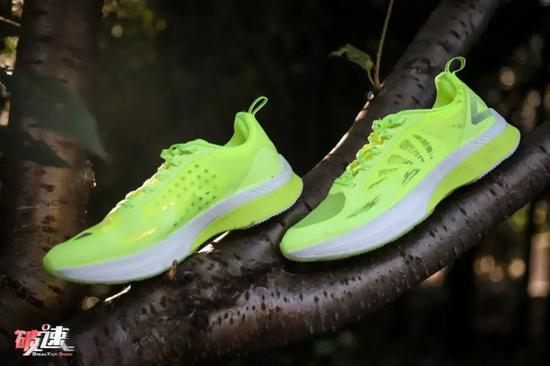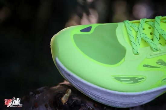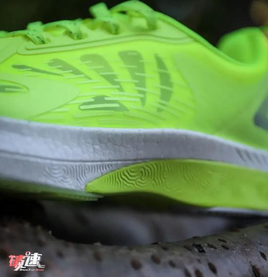 我拿到的这双UP30是荧光黄的配色,它的鞋面选用了延展性更强的琉璃纱,与传统专业竞速跑鞋尽可能减少鞋面材料从而减轻重量不同,UP30在琉璃纱的内层和外侧增加了大面积的热塑性材料,这样起到了较强的支撑效果。