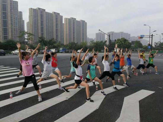 就这样,这个小区里的暑假小分队成立了,“我女儿、我们家对门邻居的孩子,还有隔壁楼的同班同学。”王春芳说,最初她就是打算带着这三个孩子简单练练的。