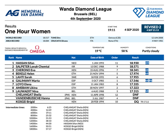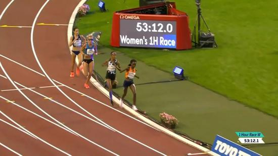 相较于男子选手这边,女子选手的竞争更为激烈。女子马拉松世界纪录保持者科斯盖也来参赛,而她的最大竞争者是荷兰名将哈桑。前59分钟,一直都是科斯盖领先,59分钟过后,哈桑展现了她强大的场地冲刺能力,最后一分钟,她大步流星的飞奔,一下子甩开的科斯盖,最终拿下18930米的成绩,成功打破世界纪录。