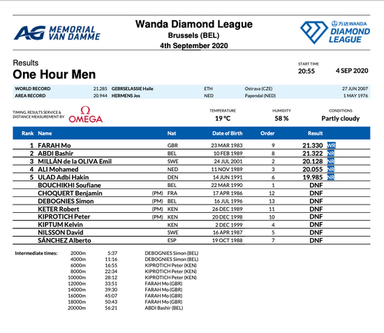 比利时选手阿卜迪去年在东京马拉松跑出2小时04分49秒的成绩,创造了国家纪录,他的马拉松成绩也要好于莫法拉。今天的比赛,他在后半程也一直在领跑。跑到20公里时他用时56分20秒02,这个成绩帮他打破了男子2万米世界纪录。最终,他1小时跑的成绩为21322米,只比莫法拉少了8米,也优于此前的世界纪录成绩。