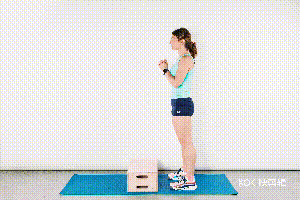 步骤1。 单脚站在一个矮箱或台阶前方,双手紧扣放在胸前以保持平衡。