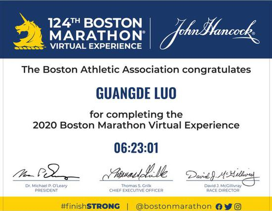 2020年罗老成功报名了波马,但由于疫情改为了线上。这次完成线上跑的他仍不满足,他渴望明年再回波士顿,弥补当年的遗憾,真正完成对六大满贯的征服,成为华人年龄最大的六星跑者。