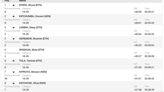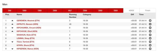 男子比赛来到半程,用时1小时02分54秒,这个速度比基普乔格破世界纪录时慢了快108秒,今天破2不可能,破纪录的希望也不大!