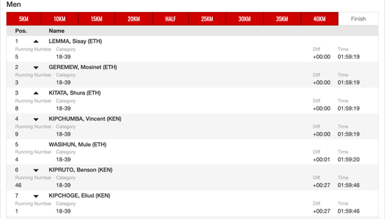 40公里,第一集团用时1小时59秒19秒,基普乔格落后了27秒。