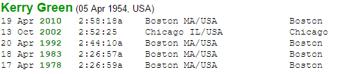 她首次破3是1979年的波士顿马拉松,2小时35分16秒的成绩完赛。此后每一个年代(10年期)她都跑进过3小时。2010年,53岁的她还跑进3小时。去年,62岁的她还跑了2场比赛,波士顿马拉松3小时04分完赛,柏林马拉松3小时02分21秒完赛,差点成为60岁以上首位跑进3小时的女性。