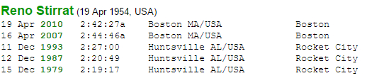 比如Reno Stirrat,这位65岁的老将在1979年破3之后,每一个年代都跑进过3小时。目前他的状态非常不错,去年他全年跑了惊人的3700英里(5900公里)。