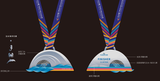 ↑ 半程马拉松完赛奖牌设计的正面以浪花门头为造型,辅以浮雕效果,下方的立体浪花造型使得整体设计更加前卫。
