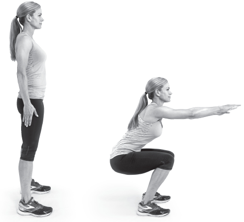 2、做下蹲动作。直到大腿与地面平行。重心放在脚后部,膝盖不要超过脚尖。手臂向前平举。恢复至初始姿势。
