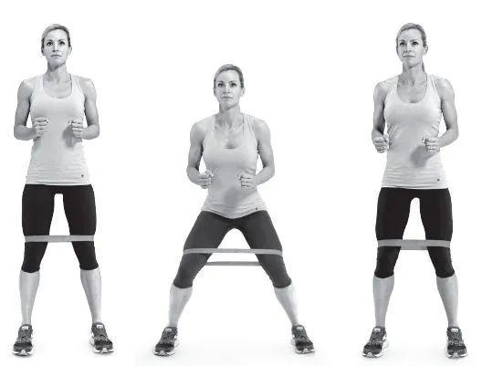 1、将迷你带置于膝盖上方。双腿与肩同宽,拉紧迷你带。