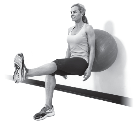 1、身体直立,双腿与肩同宽。将瑞士球置于后背中部和墙之间,保持稳定。向前远离墙迈出一步,使膝盖形成90度角,位于脚踝上方。