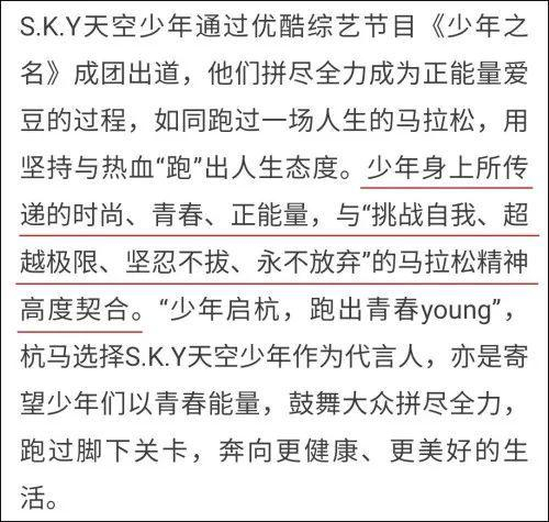 其中在官方公众号的推送文章中,杭马详细解释了选择S.K.Y天空少年作为代言人的原因,包括这个团体成员身上的精神品质与马拉松精神契合,以及马拉松这项运动在年轻人群体受到欢迎,杭马也希望有更多年轻人参与进来等。
