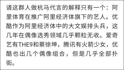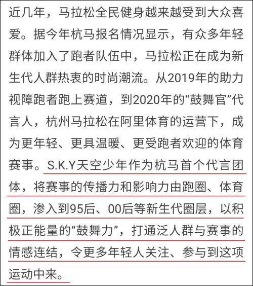 更有跑马自媒体撰文分析,认为请来S.K.Y天空少年做代言,“解释只有一个:阿里体育在推广阿里经济体旗下的艺人”。