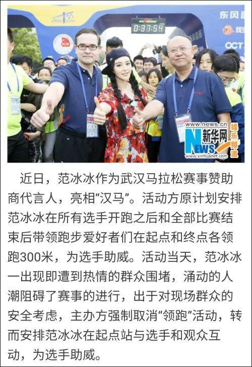 早年媒体报道提到,范冰冰助阵汉马赛事,带来人气的同时也造成了群众拥挤,影响赛事进行。