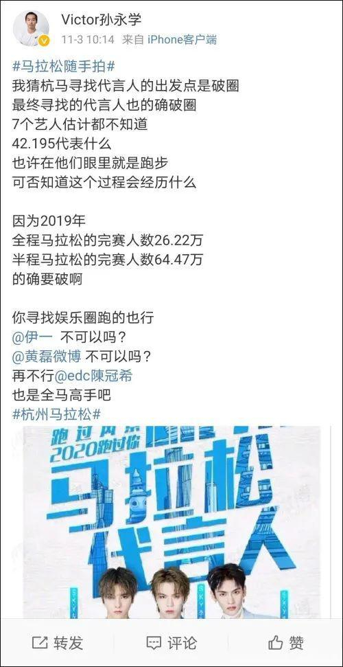 大V@Victor孙永学 指出,明星艺人中跑过全马或者是半马的不在少数,有很多都比偶像组合要合适。