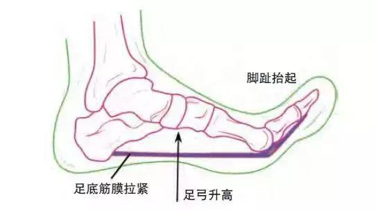 在跑步过程中,脚趾头特别是大脚趾也会背伸用力,在脚离地瞬间再助推一把。脚趾背屈时相当于在足底筋膜远端产生张力,坚硬的足底筋膜就会被动牵拉跟骨,产生“卷扬机效应”,使足弓抬高缩短。