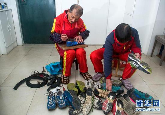 为了让鞋子穿得更久些,胡应福夫妇学会了修鞋子(11月27日摄)。