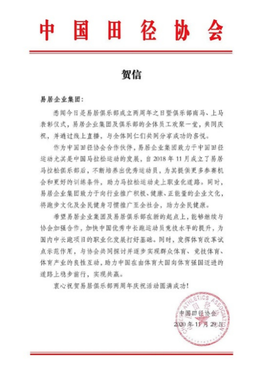 另外,中国田径协会相关领导虽因工作安排未能莅临现场,却也特别发来贺信,祝贺易居马拉松俱乐部两周年活动圆满成功。