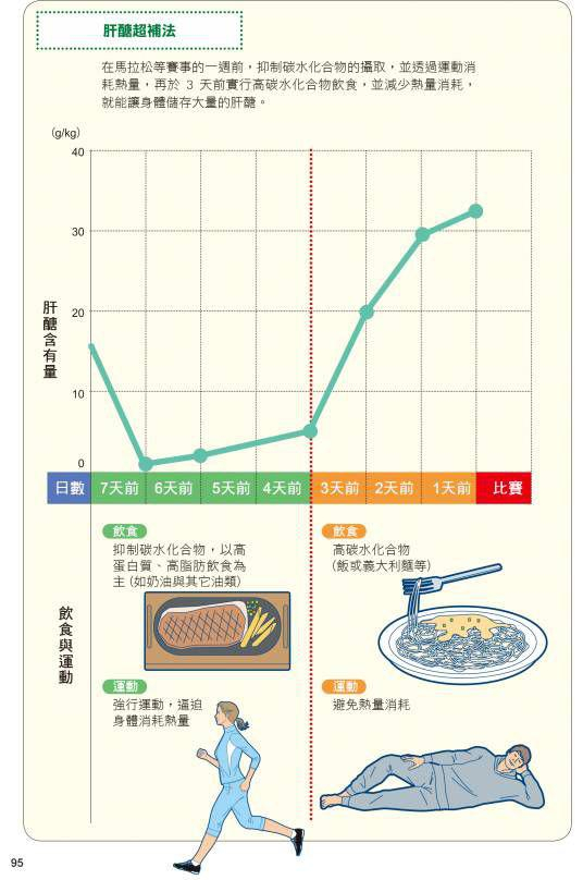 比赛前一周的前四天时间,减少碳水化合物摄入,占20%,后三天加强碳水化合物摄入,占80%,有资料显示,如果补充得当,糖原储备量可以提升一倍,非常有利于参加马拉松项目,这就是所谓的“肝糖超补法”。