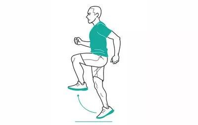 将身体重量放到右腿,将左膝拉至臀部高度向前跳。在完成第二次跳跃时,将左脚放下。换左腿支撑,右膝抬起向前跳。