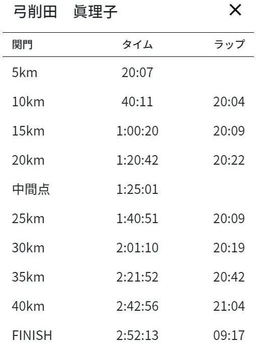 来自日本琦玉62岁的弓削田真理子,在此次比赛上跑出了2:52:13的成绩,平均配速4分05秒,刷新全马PB,同时也将自己保持的60岁以上女子世界纪录(2:56:54)提高了4分41秒!