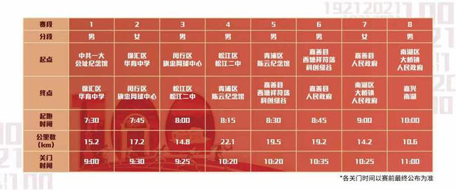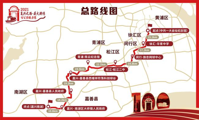 比赛将于4月11日(周日)上午7:30开始,赛事起点为中共一大会址,终点为嘉兴南湖,途经上海市黄浦、徐汇、闵行、松江、青浦区,浙江省嘉兴市嘉善县和南湖区,全程132.8公里,共8条赛段,100支参赛队伍,每支队伍由8名正式参赛选手(6男2女)和2名替补选手(1男1女)组成,8名参赛选手在起点及各接力点顺次错时起跑,各接力点起跑人员为100人。沿途7个接力点分别为上海市徐汇区华育中学、闵行区旗忠网球中心、松江区松江二中、青浦区陈云馆,浙江省西塘祥符荡科创绿谷、嘉善县人民政府、嘉兴市南湖区大桥镇人民政府。8条赛段分别为15.2公里、17.2公里、14.8公里、22.1公里、19.5公里、19.2公里、14.2公里及冲刺段10.6公里,其中第二、第七段为女选手。100支参赛队伍将通过定向邀请和社会公开招募的方式产生。考虑到本次赛事路线较长,为提高赛事安全性,各接力点按固定时间起跑,起点发令时间为7:30,前七段的发令时间分别间隔15分钟,最后一段的发令时间为上午10:00,预计所有选手抵达嘉兴南湖的时间为11:00。