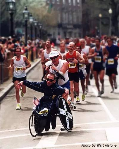 2009年的马拉松,是“霍伊特之队”的第1000场比赛。儿子Rick说,如果要选一场每年必参加的比赛,那一定是波士顿马拉松,那是他最喜欢的赛事。