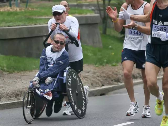 曾有人告诉Dick,以他的实力,如果他单独参赛,他的成绩不会亚于专业选手。可是Dick不愿独自参赛。他说:“Rick是我的动力,是他激发了我。他才是真正在比赛的人,我只是借给他我的胳膊和腿脚。当我与Rick一起比赛的时候,有一种我无法解释的力量让我跑得更快、更远。”