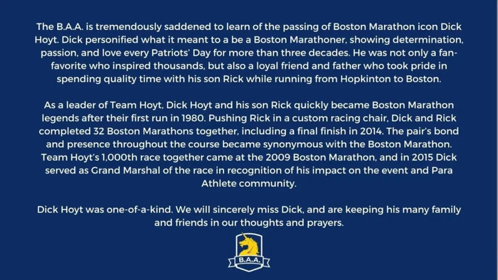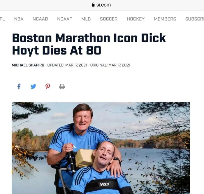今天,国内外的社交媒体上传来了一条令人心疼的消息:铁三名人堂成员,波士顿马拉松的代表人物之一,推着轮椅带着儿子完成了超过1000场马拉松、铁人三项赛的运动员,迪克·霍伊特(Dick Hoyt)去世了,享年80岁。