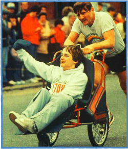 1977年的春天,15岁的Rick告诉父亲, 他想参加一场为一位不幸遭遇车祸而残疾的曲棍球运动员举办的慈善长跑。并没有专门练过长跑的Dick同意为儿子推着轮椅,一起完成这场8公里的比赛。那一次,他们获得了倒数第二名。当天晚上,Rick告诉父亲:“爸爸,当我跑步的时候,我感觉自己好像没有残疾。”