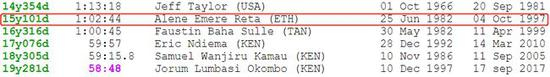 那么,15岁的半马世界纪录有多快呢?1:02:44,是不是更可怕?