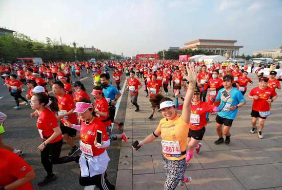 从清晨5点半起,选手们就陆续来到天安门广场,进行检录、热身,为比赛做着最后的准备。北京市委副书记、市长陈吉宁,中国田径协会主席段世杰,北京市副市长张建东,北京市副市长、市政府秘书长靳伟,北京市政府副秘书长尹培彦,中国田径协会副主席蔡勇,中国银联股份有限公司董事长邵伏军为比赛鸣枪发令。起跑仪式由北京市体育局党组书记、局长赵文主持。7时整,选手们冲出起跑拱门,激情奔跑。