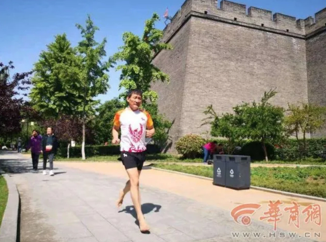58岁男子坚持赤脚跑步5年 每天清晨城墙下跑10公里