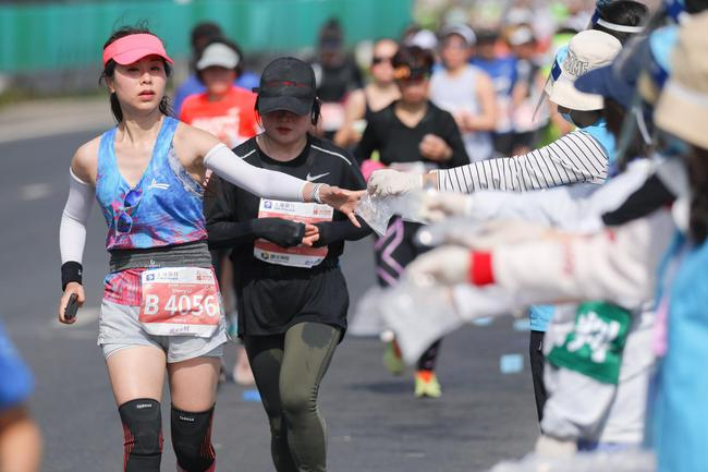 5月的上海,气温逐渐升高,比赛当天7-10点的气温更是高达23℃。为此,组委会做好了完善的保障服务,赛前通过短信及公众号推文的形式,鼓励选手量力而行,重在参与。选手领取到的装备包内,组委会贴心的准备了高温应对指南,指引跑者选择正确的参赛服装及补水方式。赛事自5公里起,每5公里设有饮水饮料站,备有饮用水、功能饮料及盐丸,自7.5公里处开始,每5公里设有用水站,通过用冷水浸泡的海绵帮助跑者及时降温,补充水分及电解质。赛道12.5公里及17.5公里处设有补给站,为跑者提供香蕉,改善体能。考虑到本次马拉松赛事天气情况的特殊性,组委会在21.0975公里的赛道上设置了8个喷淋站及5个冰站,参赛者可以取用装有碎冰的冰袋,直接冷敷于面部及后脖颈部,或是取一至两块放于运动内衣里,进行物理降温。