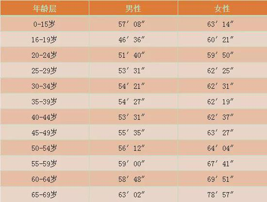 * 不同性别,不同年龄段10公里平均配速表,仅供参考。