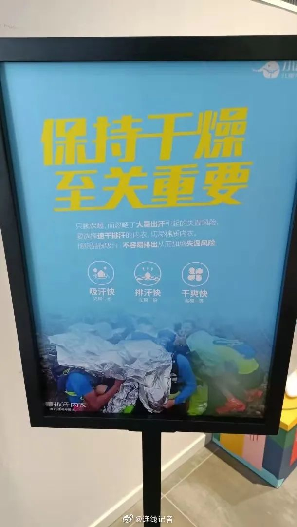 广告的主题叫“保持干燥,至关重要”,该广告选用了一张甘肃越野赛的照片,画面里选手抱团取暖,看上去十分凄惨。
