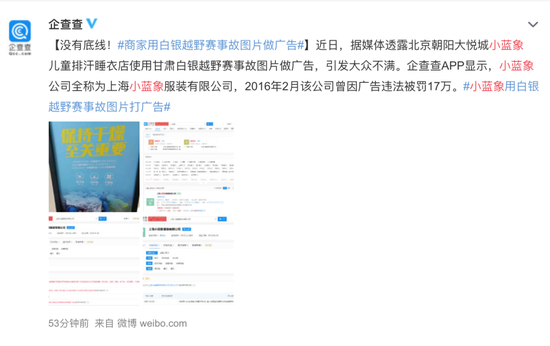 虽然商家已经致歉,但媒体还是呼吁,相关部门应当介入调查,@时间视频发布了锐评《以灾难照片做促销,吃人血馒头的商家还能再冷血点吗?》:北京朝阳大悦城里,一则售卖儿童睡衣的广告触目惊心,刺痛肺腑。这则广告,位于大悦城的小蓝象儿童睡衣店铺。广告以刚刚痛失21条生命的白银马拉松越野赛为背景,以几名参赛选手挤在一张保温毯下取暖求生的灾难照片为卖点,为小蓝象儿童睡衣产品,打出了“保持干燥、至关重要”的宣传广告。商家卑鄙如此,着实令人恶心。虽然小蓝象店铺这则广告已撤,但它伤害的不仅仅是公序良俗,更涉嫌违反法律,有关部门应该认真追究,以儆效尤。