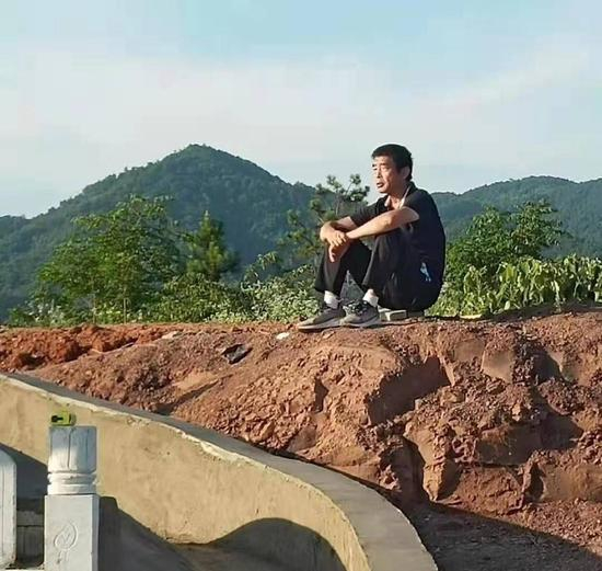 魏普龙坐在梁晶的坟冢上。图/合肥跑协