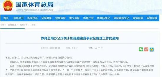 在兰州马拉松组委会发布的公告中,专门提到兰州马拉松延期是 “鉴于当前疫情外方输入压力较大等因素” ,其实在白银山地马拉松发生公共安全事件之后,全国约有 60 场即将鸣枪的路跑赛事宣布延期或者取消,兰州马拉松只是其中一个。显然,这与国家体育总局在 5 月 23 日晚紧急召开的 “全国体育系统加强赛事安全管理工作会议” 有着直接关系相关。因为在那次会议上,体育总局明确提出要求,进一步压实体育系统的赛事安全管理工作,不断完善体育领域安全风险防控制度和举措,同时还要建立同类型体育赛事的熔断机制。