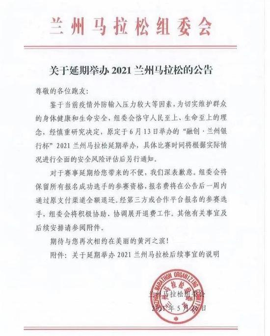 当然,如果你是一位马拉松爱好者,正准备参加兰州马拉松,又或者你是兰州马拉松组织者或志愿者,曾为今年兰州马拉松的筹备付出过努力,如今在赛事取消后,有这样的带情绪的表达是完全可以理解的。但需要注意的是,在中国田径协会发布的《通知》中,只明确了第十四届全国运动会田径马拉松项目资格赛取消,并没有宣布今年的兰州马拉松也一并取消。事实上,就在 5 月 26 日,兰州马拉松组委会发布公告,称延期举办 2021 兰州马拉松,具体比赛时间将根据实际情况进行全面的安全风险评估后另行通知。