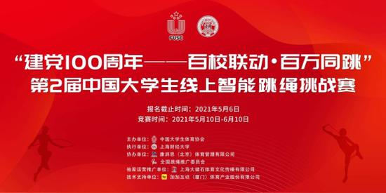 为隆重纪念中国共产党成立100周年,回顾党的光辉历程,追溯红色记忆,增强当代大学生对中华民族的认同感和自豪感,进一步弘扬爱国主义精神,由中国大学生体育协会主办,上海财经大学执行,康湃思(北京)体育管理有限公司、全国跳绳推广委员会协办,上海大健石体育文化传播有限公司独家运营推广,加加互动(厦门)体育产业股份有限公司提供技术支持的第2届中国大学生线上智能跳绳挑战赛于2021年5月10日-6月10日成功举办。