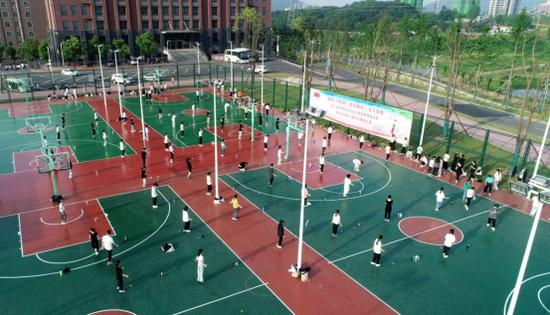 信阳学院200余名学生在校领导的有序组织下,在烈日与冰雹的双重侵袭中越战越勇;为检验打卡挑战对当代大学生跳绳技能与体能的促进作用,贵州师范大学在收官阶段向中国跳绳段位制速度耐力等级排位赛发起冲击,110名大学生同场挑战3分钟单摇跳;鄂尔多斯应用技术学院师生朗诵原创体育诗歌《新时代 我们来了》,学生合唱《迎风飘扬的旗》,让爱国情怀再一次在心中澎湃。