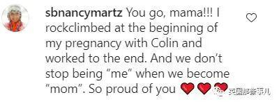 “我在怀着孩子的初期就开始攀岩,一直到最后。当我们成为妈妈时,也不会停止做自己,真的为你骄傲!”