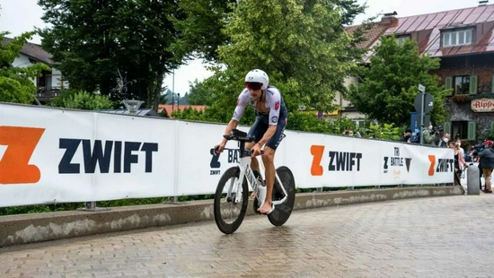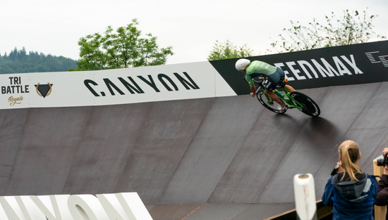 在换项时,弗洛丹诺似乎有些手忙脚乱,先是把骑行头盔掉在了地上,出发时也忘记穿鞋子。这次对决的自行车赛道很直,在弯道的设计上,还加入了类似场地自行车的,带有倾斜的弯道,利于选手一直保持高速,最终,弗洛丹诺用时3小时55分22秒完成,时速达到惊人的46公里。