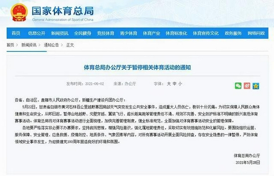 2021 年 5 月 22 日,甘肃白银山地马拉松赛事遭遇极端天气,参加本次赛事的 127 名选手中,有 21 名参赛人员遇难,其中包括梁晶、黄关军、吴攀荣等业界跑神级人物。另有 8 人轻伤。伤亡率高达 16.9% 。悲剧发生后,国家体育总局,迅速采取行动,除了暂停、延期一部分已经准备举行的马拉松赛事,还要求加强路跑赛事安全管理工作,暂停山地越野、戈壁穿越、翼装飞行、超长距离跑等新兴高危体育赛事活动。此外,体育总局还对体育赛事活动进行全面梳理,加快完善管理制度,健全标准规范,全面加强对体育赛事活动安全的管理保障。