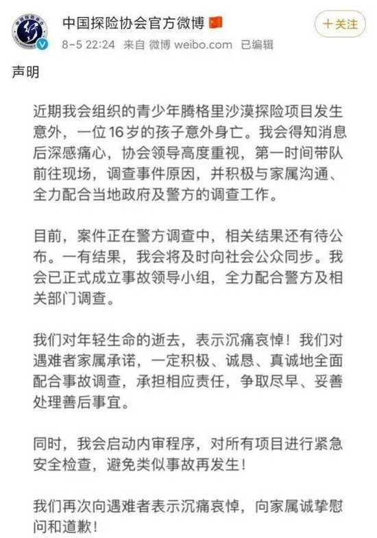 国家体育总局虽然暂停了相关体育活动,但一些小规模的探险活动并不受这一禁令的管辖。没想到,悲剧就这样发生了。今年 7 月 29 日,一名 16 岁的北京高中生在参加沙漠探险项目时命丧腾格里沙漠。“中国探险协会官方微博” 近日发表声明称,近期该会组织的沙漠探险项目发生意外,一位 16 岁的孩子身亡,目前警方正在调查。协会官网介绍,该协会成立于 1993 年 3 月,是中国探险的行业协会与最高组织机构。