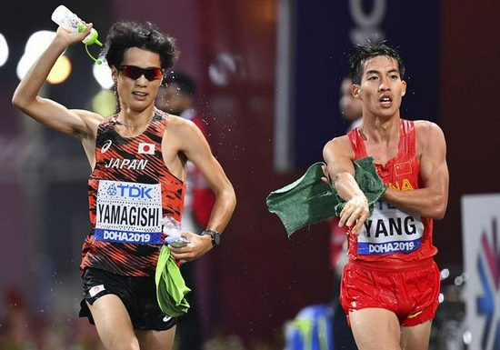 2019年多哈世锦赛杨绍辉(右)获得第20名,成绩盖过日本选手。资料图/IC photo