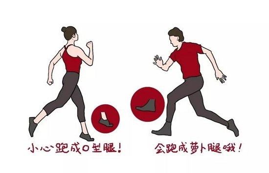 由于落地时没有缓冲和过渡,很容易“蹲脚“,而且还容易震伤颈椎,在柏油马路等硬地上跑步就更是如此,长此以往还容易引发胫骨骨膜炎,跑成O型腿。