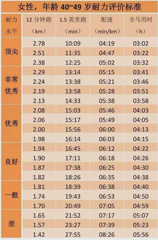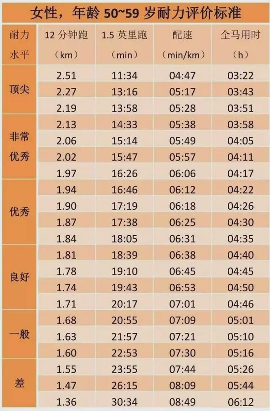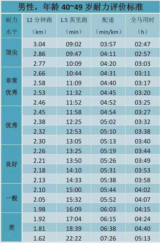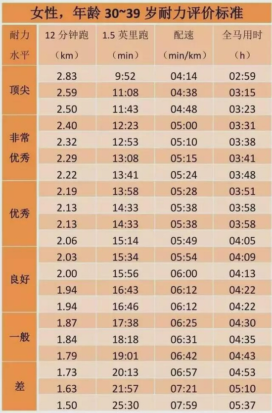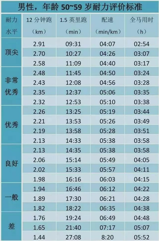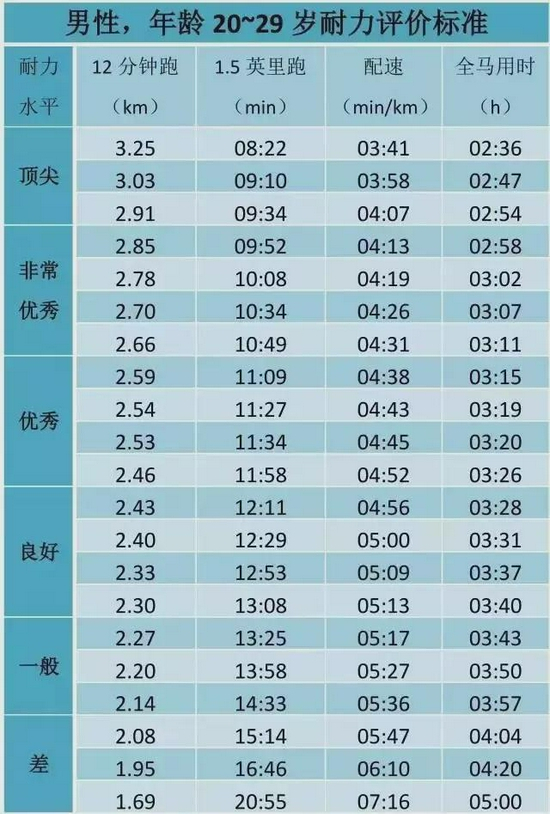 注:国际耐力标准,与大多中国人相比可能偏高。参考上表比照自身时,可允许略微降低相关数据的标准。